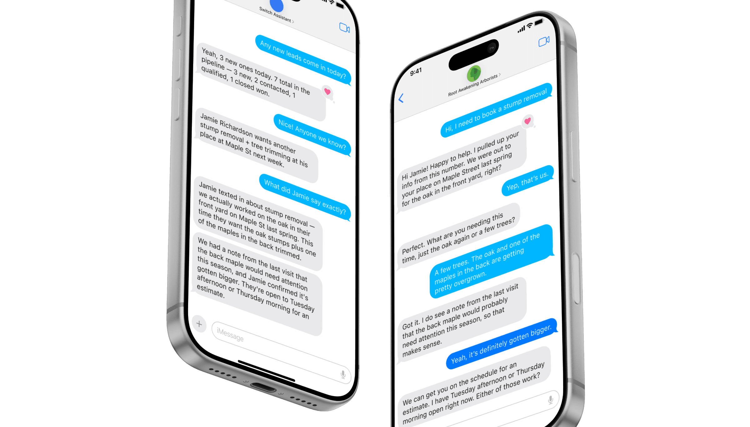 Your customers text your dedicated number and get an instant, natural reply. Switch asks the right questions — location, scope, timing — and captures everything so you can quote without playing phone tag.